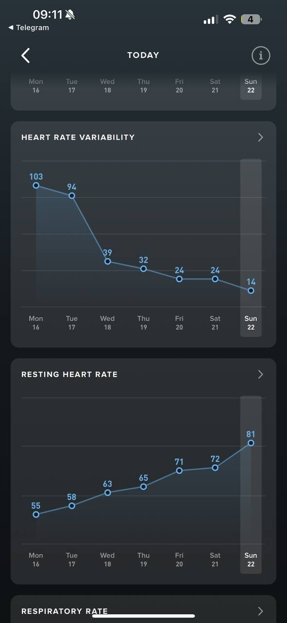 Работа сердца и сон — показатели отличаются всего на 5–10%. Интересно, что иногда Whoop показывает аномально высокий уровень ВЧП, которого, по данным Garmin, у меня не было за последние пару лет.