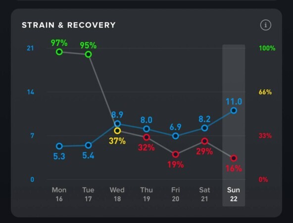 В это же время Whoop оказался намного более дружелюбным: он оценивал уровень моей физической нагрузки не только по количеству и интенсивности тренировок (которых практически не было), но и по общему уровню напряжения, которое испытывало моё тело в течение дня.