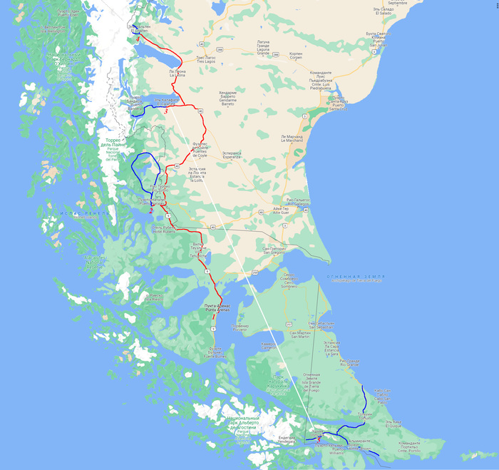 Мои сомнения развеялись в тот момент, когда я нашел на карте национальный парк Торрес-дель-Пайне. И тут меня понесло. В какой-то момент я даже начал сомневаться — а стоит ли вообще лететь в Антарктику? Скалы, ледники, озера, почти как в Антарктике, только теплее. Пингвинов можно посмотреть и в Пунта-Аренас, а за миграцией китов можно наблюдать в проливе Бигл. Что ещё надо? Но мысль о том, что тогда придется создавать канал «Огненная Земля Онлайн» убила во мне мои малодушные сомнения. В итоге, после месяца шаманства над картами и поиском от Google скромный 3-ий пункт маршрута «Пунта-Аренас — Сантьяго — Сан Паулу» немного подрос за время пути.