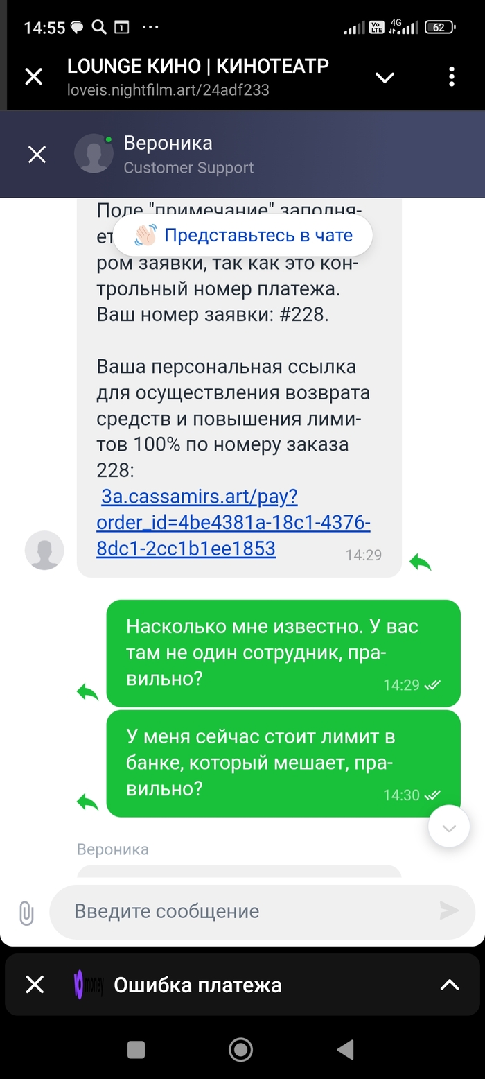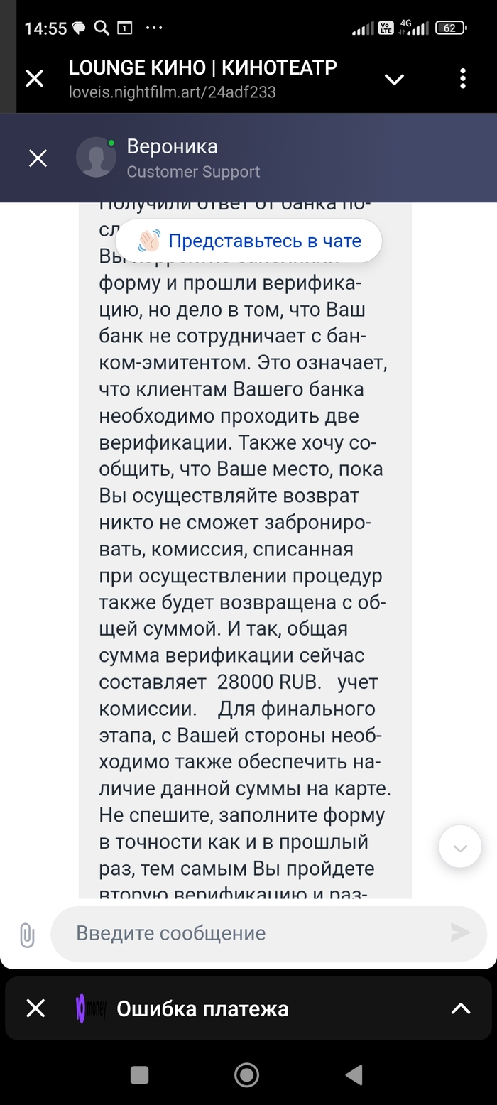 В общем, произошёл у меня на VK-знакомствах так называемый матч (я поставил лайк девушке - она мне). В чате попросила перейти в телеграмм. Вроде ничего не обычного. В телеграмме у нас произошёл небольшой диалог: что нравится, что не нравится. Мы вроде как даже с одного города, так было указано у нас в анкетах. Обычная схема построения первого диалога. Правда она могла делать крупные перерывы между ответами - примерно по часу и даже больше, но это ничего. Моя интуиция кульнула меня тогда в первый раз - её сообщения были построены как-то странно, будто это универсальный набор текста, мало касающийся того, что я отвечал. Но это ладно. И вот она пропала на два дня и когда вновь объявилась предложила куда-нибудь сходить. Выбор пал на какое-то место: LOUNGE Кинотеатр. Дала мне ссылку на их сайт: отдельные залы на двоих, пицца, попкорн, но вот беда - нужно бронировать. Это попросила сделать она, поскольку у неё нет денег на карте, только наличные. В процессе оформления бронирования, интуиция кольнула меня ещё раз, она сказала: "Первая девушка с который ты общался за эти три года. И первое что она попросила - это трата от тебя денег. Что-то тут не так, нет?". Я, будучи без айкью как такового, проигнорировал это. Всё таки я и вправду как правильно домосед, никуда не хожу и ничего не делаю, с противоположным полом не общался. И решил, что хотя бы схожу в интересное место.