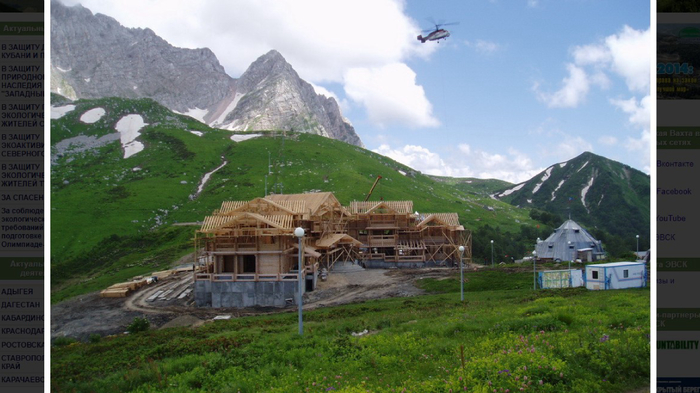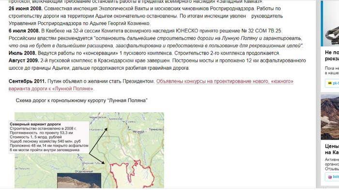 Возводили горнолыжный комплекс на Лунной Поляне югославские строители по проектам финских специалистов. В итоге на склоне горы Фишт появилось трехэтажное шале из соснового бруса, который по спецзаказу изготовили в Карелии. Все стройматериалы на Лунную Поляну завозились с помощью грузовых вертолетов. За день каждый Ка-32 делал не меньше 10 полетов. Таких геликоптеров было несколько. В 2003 году один из вертолетов, перевозивший на Лунную Поляну бригаду сварщиков и баллоны с газом, врезался в отвесную скалу и разбился. 9 человек погибли. Год спустя у другого Ка-32 с подвески сорвался многотонный груз, придавивший стоящего на земле рабочего. Из-за ошибок, допущенных в проекте и при производстве работ, исчезла ключевая вода в местном источнике, поэтому в 2006 году перед Пасхой, когда стало известно, что тогдашний гарант Конституции прилетит на Лунную Поляну покататься на лыжах, воду на поляну завозили вертолетами, причем тоннами, на случай если бы он (гарант) захотел не только руки помыть, но и в бассейне искупаться. Не обошлось и без маленького «Химкинского леса»: путинские чиновники вырубили местный заповедный лес для постройки канатной дороги. Открывшаяся картина массового уничтожения леса на территории объекта Всемирного Природного Наследия «Западный Кавказ» в долине речки Чигурсанка впечатляла. Пустыня вырубленной просеки рассекала эту долину, начинаясь и заканчиваясь на границах Кавказского заповедника. Увиденное полностью подтвердило информацию о том, что летом 2007г. ниже комплекса «Лунная Поляна» в девственном лесном массиве на территории памятника природы «Верховья рек Пшеха и Пшехашха» (входит в состав объекта Наследия «Западный Кавказ») была вырублена просека длиной несколько сот метров и шириной около 30 метров. Здесь планируется проложить канатную дорогу. Просека была проложена даже без попытки как-либо узаконить эту вырубку – просто волевым решением высокопоставленных лиц, стоящих за проектом комплекса «Лунная Поляна», очевидно совершенно уверенных в своей безнаказанности и поэтому действующих без оглядки на что-либо, в том числе, и на Закон.