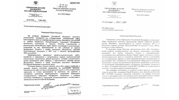Строить дачу помогала «Роснефть», а коммуникации туда подводились за счет федерального бюджета. «Управление делами президента Российской Федерации осуществляет общее руководство проектом строительства объекта. «Полигон научного центра «Биосфера»… имеет особую важность», — писал 9 сентября 2006 года управделами президента Владимир Кожин министру природных ресурсов Юрию Трутневу. В этом послании Кожин настоятельно просит Трутнева дать указание заповеднику подписать акты согласования строительства научного центра «Биосфера» на его территории и называет заказчика строительства — ОАО «НК «Роснефть»