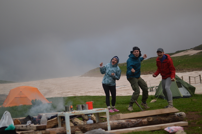 Пройдя в первый день 20+ км, мы моментом уснули и поднялись к 9 утра. Шел дождик, было грустно. Но погода в горах меняется моментально, буквально через час тучки разбежались, выглянуло солнышко. Мы вылезли из палаток, умылись и начали собираться и готовить завтрак. На завтрак у нас были макароны с тушенкой. Плотно позавтракав, мы двинулись на Фишт-Оштеновский перевал. Вот заснеженное озеро Псенодах