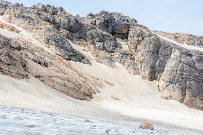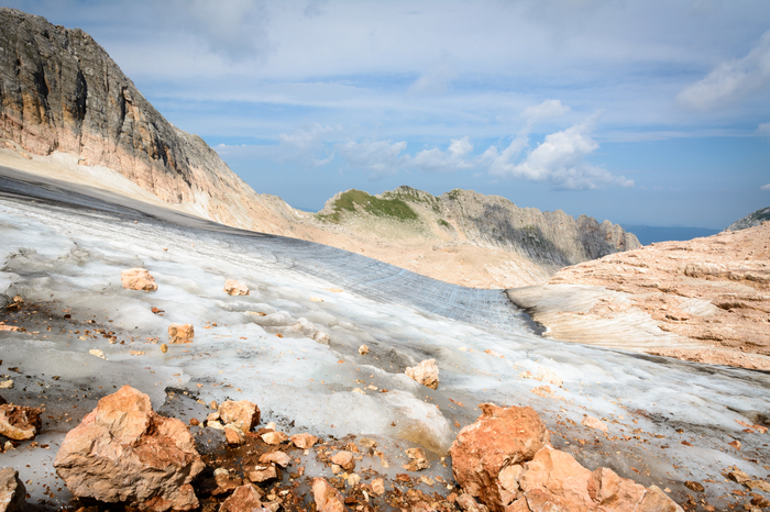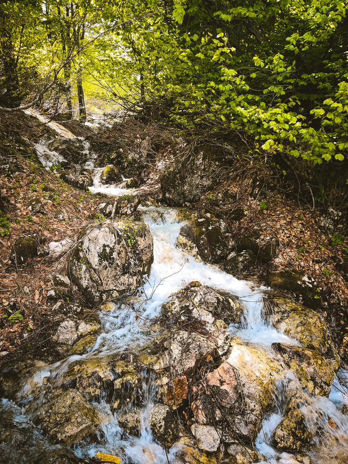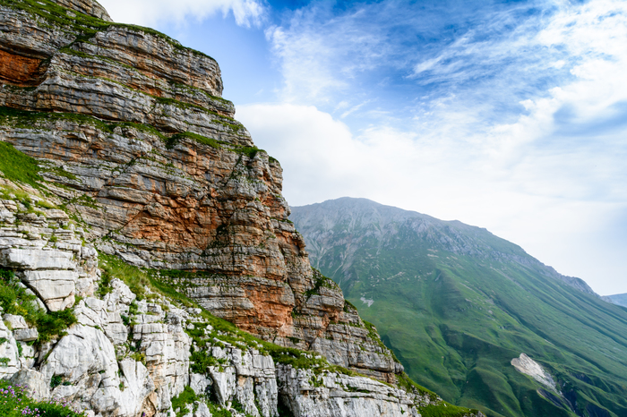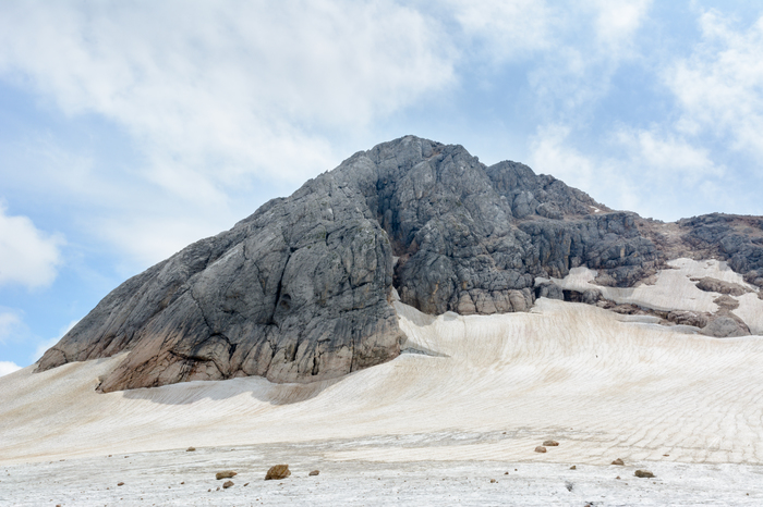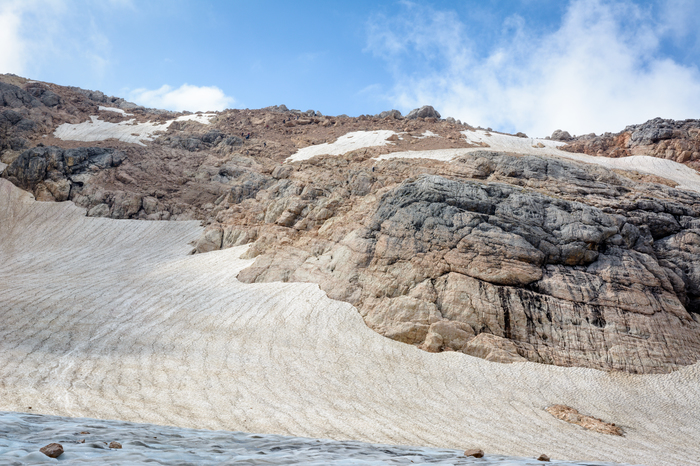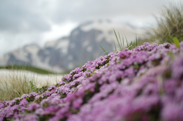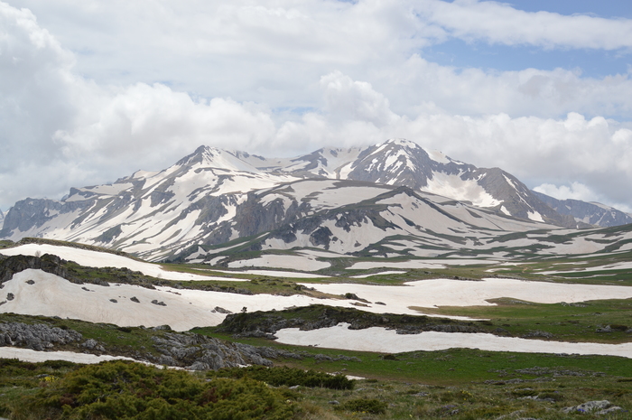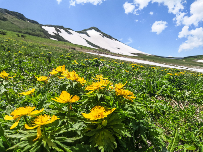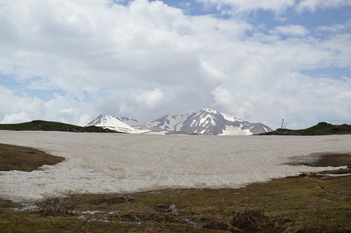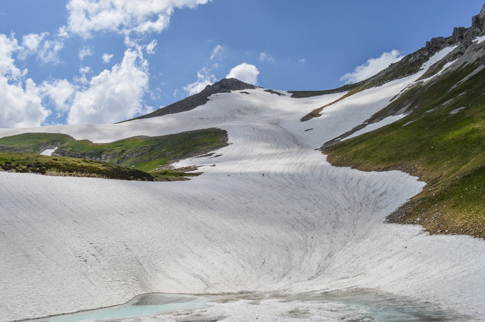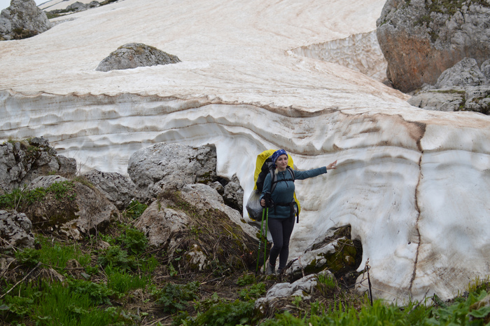 Тропинка у подножия горы Оштен была скрыта под слоем снега. Мы переживали насчет схода лавин и оползней. Решено было идти долгой дорогой через приют Цице, маршрут удлинняется. Кстати, тропинка иногда пропадала, столбики погнуты от схода лавин. Где-то приходилось идти вслепую, наугад. Цветов на лугах было видимо-невидимо. Поразительный контраст снега, зелени и цветов!