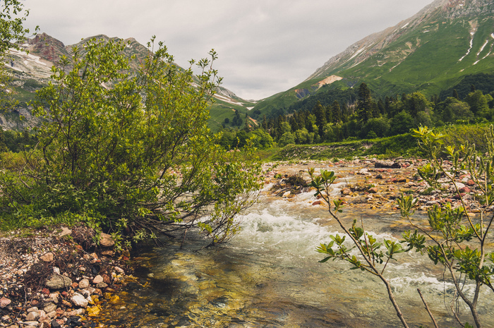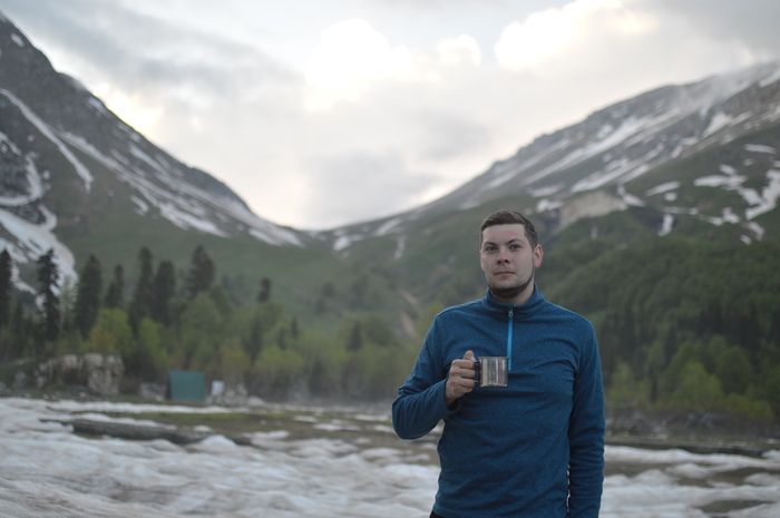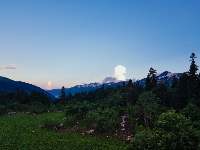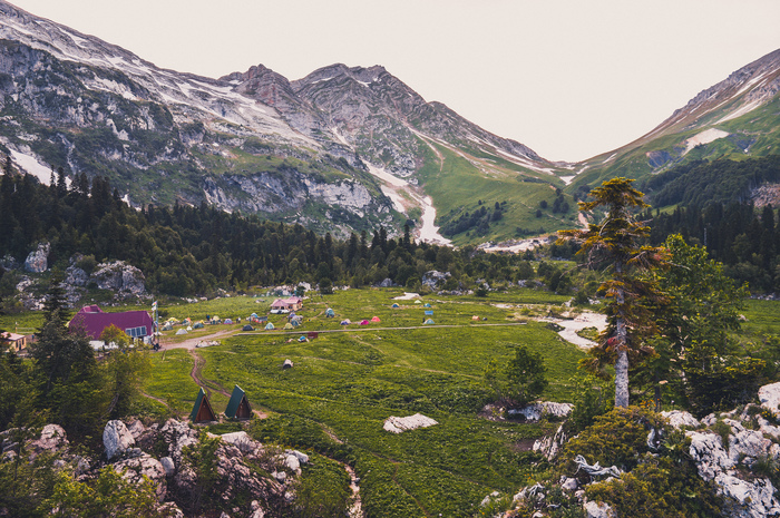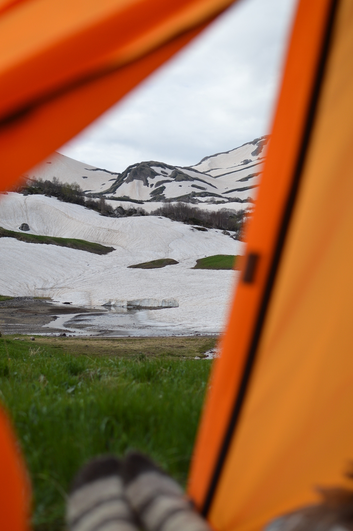 До озера Псенодах мы добрались к 20:00, в горах уже темнело. Вот такой вид открывался из палатки. Как же было приятно смотреть на это с утра!