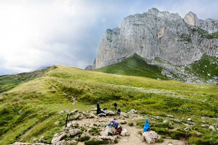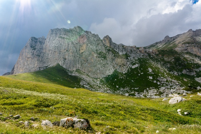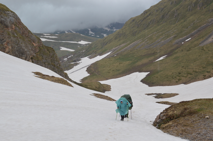 В пути на Фишт-Оштеновский перевал нас настиг дождь... Да что там дождь, ливень! С градом! Мы промокли насквозь, дождевики хоть и защищали тело, но ноги и руки промокли. Тучи как-будто цеплялись за горы обволакивая все вокруг и заряжая стену дождя с новой силой.
