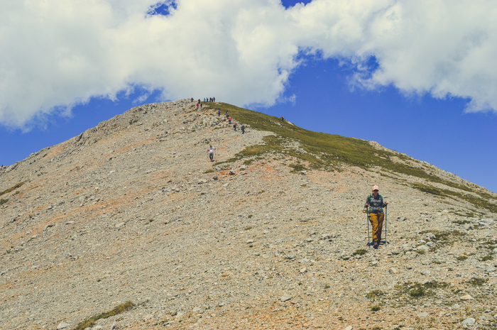 Сгущаются тучки, время перевалило за полдень. Прошли около 10-12 км. Только только прошли «Инструкторскую щель», до которой нам разрешил идти лесник. Идем мимо горы Оштен. Ваня успел поставить фотик и прибежать к нам.
