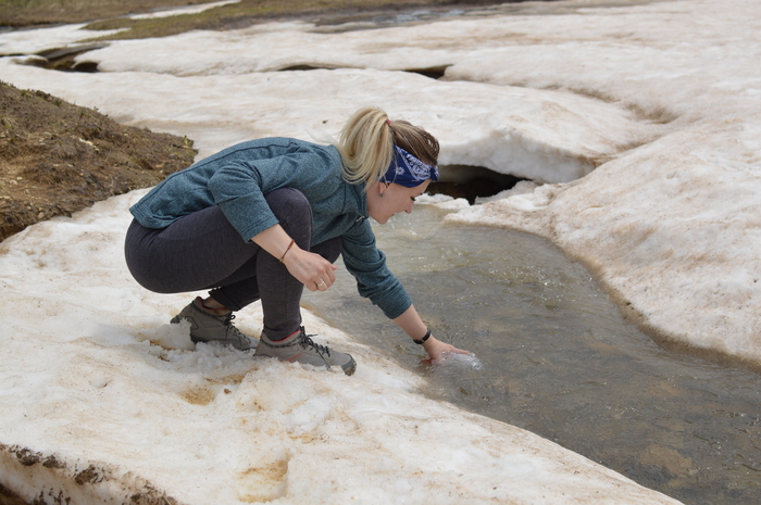 Воду набирали из ручейков, их там много, вода чистая, прозрачная, холодная. По вкусу похоже на талый лёд)) Наташка набирает воду.