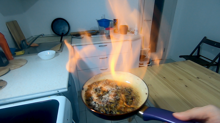Естественно спирта не хватает, не тот это продукт, чтоб его прям по стакану сразу выливать. Я ж умный, я ж всегда так делал: берем полупустую стеклянную бутылку со спиртом и поливаем на почти потухшие котлеты. 2 раза -- норм, на третий... Ну вы уже поняли, что получилось на третий. "Наберите воздуха в грудь. Побольше. Готовы, да?" (с)