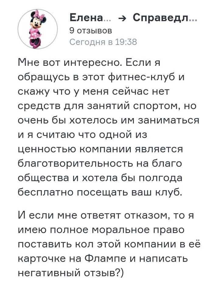 Наткнулся на отзыв, где компании по доставке воды поставили единицу и написали плохой отзыв за то, что она отказалась бесплатно (в виде благотворительности) предоставить воду для местного марафона.