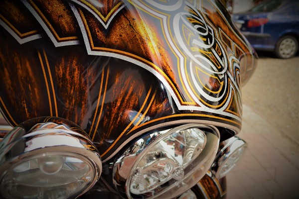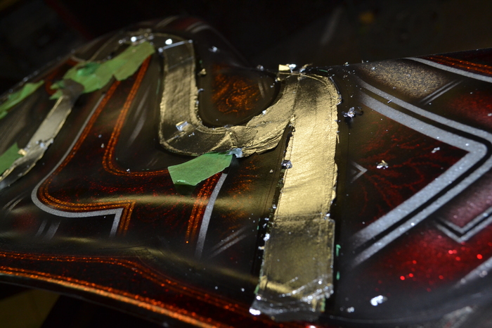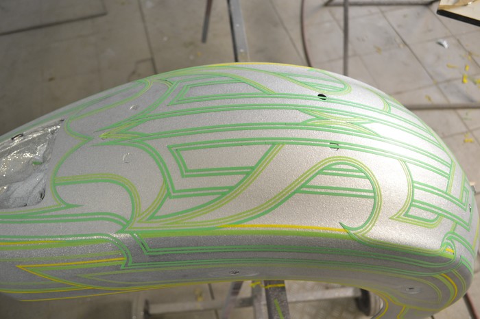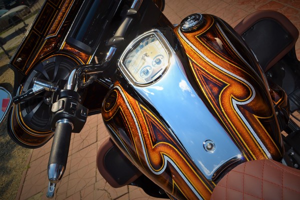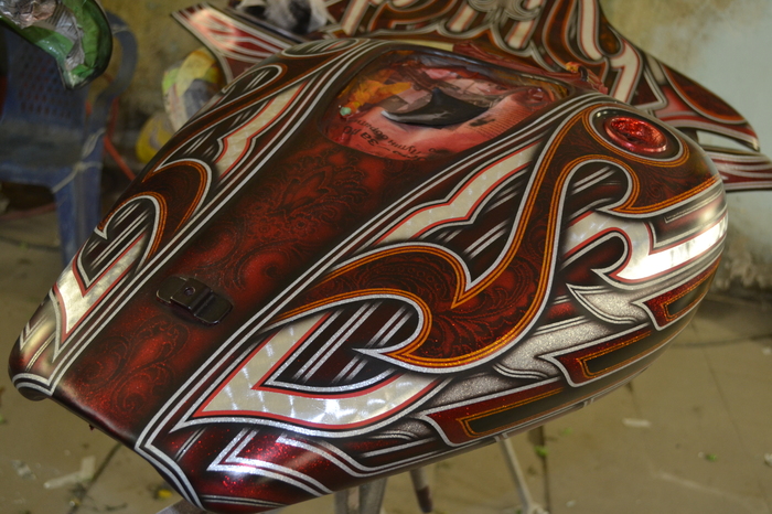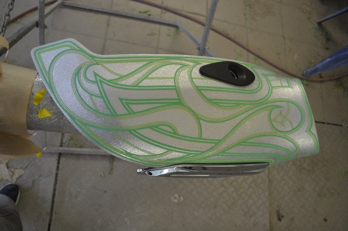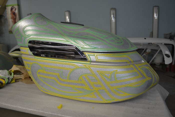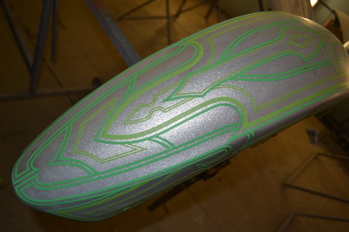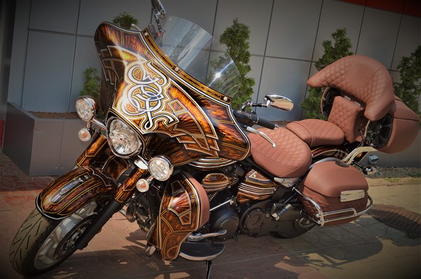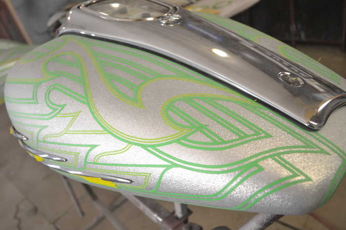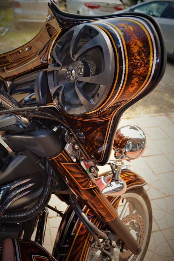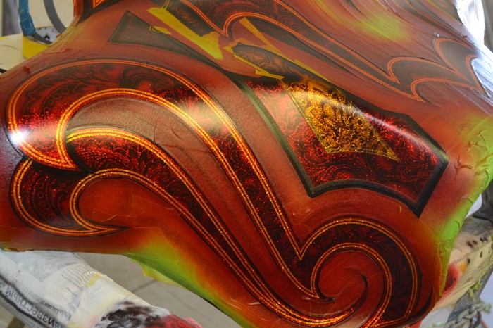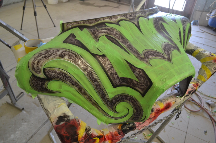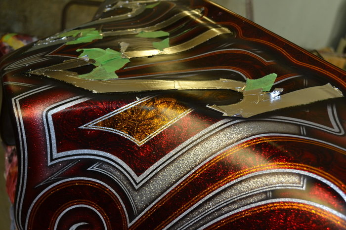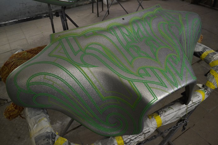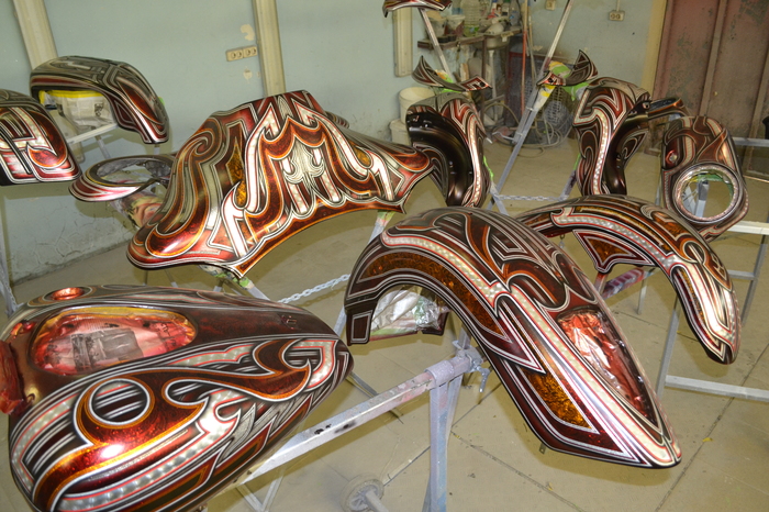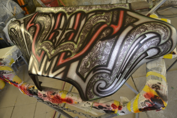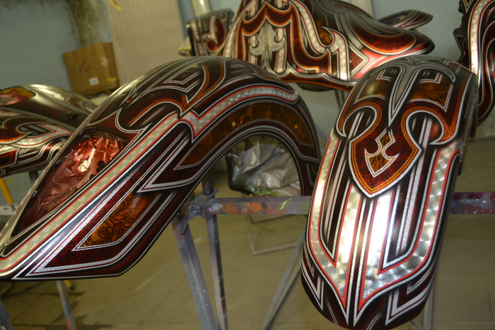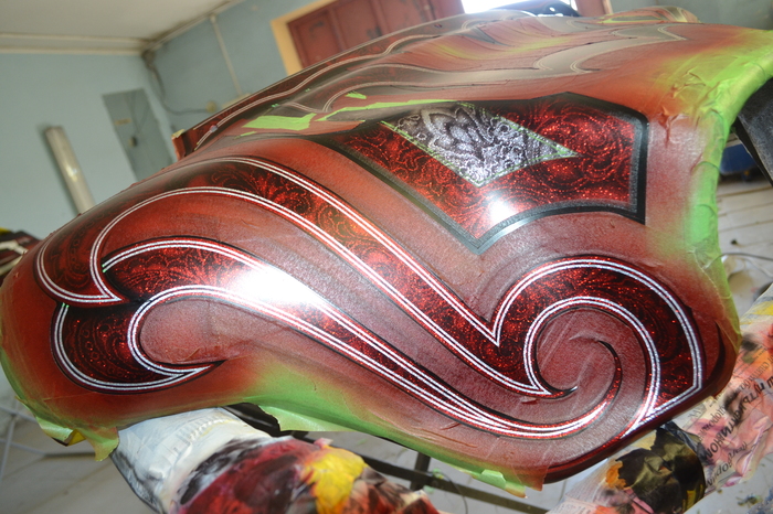 Покраска в стиле CUSTOM LOW RIDER. Одна из самых эпичных и зрелищных покрасок в мире. Так же это очень долгий, сложный, ювелирный процесс покраски. Так как для начала все детали покрываются плотной искристой подложкой из флейков (блестяшки) имитирующей искренние страз. А затем на поверхности создаётся виртуозная головокружительная контурная графика различных элементов из полос разной толщины. Затем часть пространства этой графики наполняется с помощью гипюр или в простонародье тюли узороми в виде рюшек и вензелей. Дальше по этапно красится самыми сочными в мире но очень прозрачными красками, которые называются кенди. Добавляются различные декоративные элементы в виде полос потали (имитация сусального серебра) на которых выфрезеровываются круги которые будут бликовать и переливаться на солнце и поверхность таких элементов становится похожа на подобным образом фрезерованную нержавейку советских времён. Всё это великолепие покрывается адским количеством лака, шлифуется и опять перекачивается.