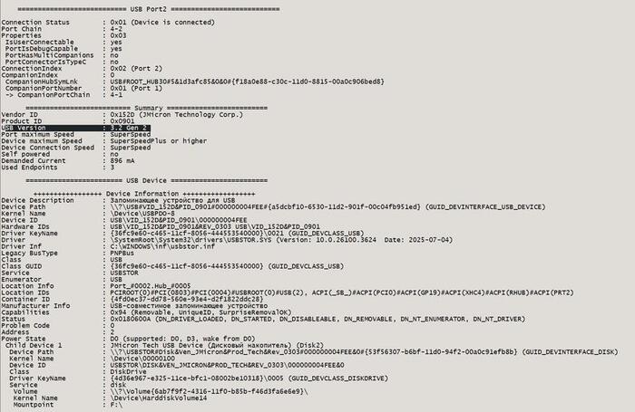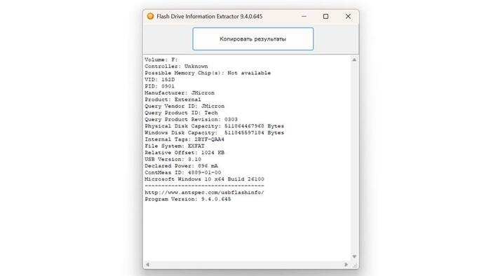 Эти данные соответствуют контроллеру JMicron JMF602 (JMicron Technology Corp.). Типичный и недорогой контроллер, который встречается на большинстве бюджетных USB флешках и SSD.