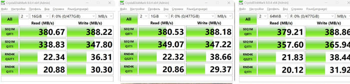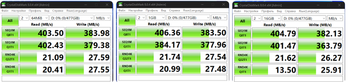 На более свежем мини-ПК получается чуть больше 400 МБ/с. Конечно, заявленные 450 МБ/с являются максимально достижимыми для данного типа контроллера/интерфейса. Но и с такой скоростью скопировать фильм или образ диска не составит труда. Я обычно копирую фильмы-мультики для поездок, и для просмотра на планшете во время досуга.