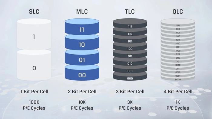Современные бюджетные модели потихоньку перебираются и на QLC — память с четырехбитовой ячейкой. Она все так же может обеспечить достаточно неплохую скорость чтения, но запись у таких накопителей часто проваливается даже ниже 10 Мб/с. К тому же ресурс у QLC памяти самый низкий и часто не дотягивает до 1 000 перезаписей.