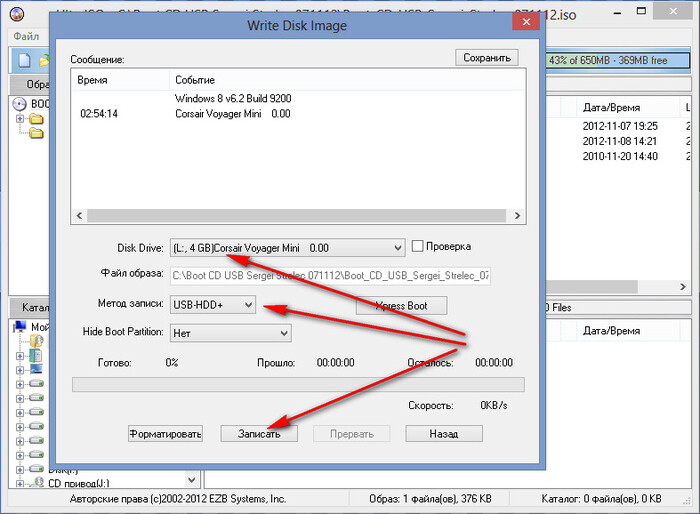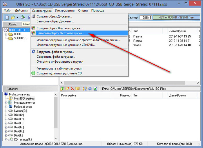 2. Открыть образ (обычно iso-файл) в программе UltraISO Premium, выбрать: