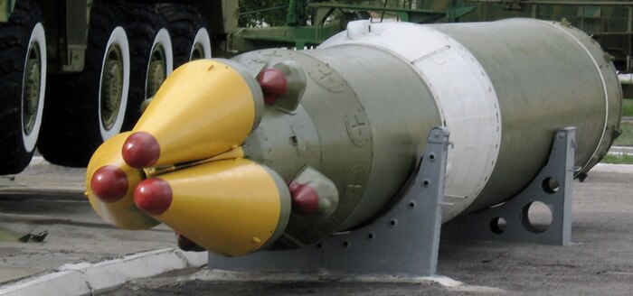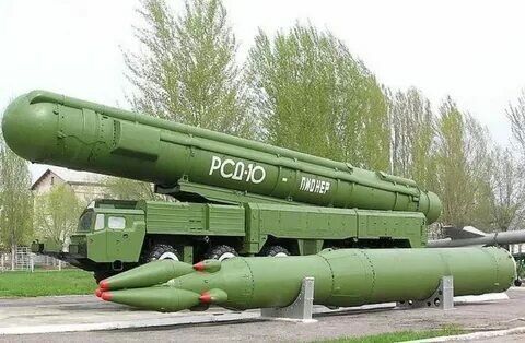 РСД-10 "Пионер". Ракета несла разделяющуюся головную часть с тремя боевыми блоками мощностью по 150 кт каждый с индивидуальным наведением на собственные цели. Ступень разведения включала систему управления и твердотопливную двигательную установку. Аэродинамический обтекатель на головной части не предусматривался. Для снижения аэродинамических нагрузок в полёте, конические боевые блоки были установлены под углом к продольной оси ракеты.