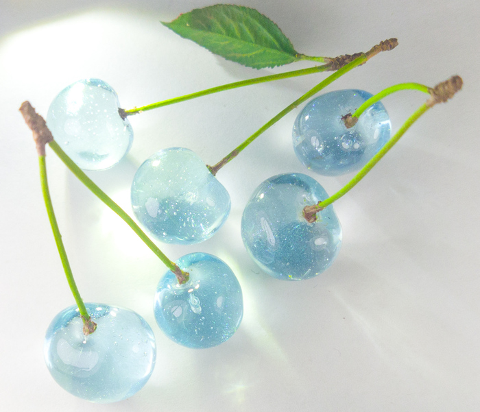 Как я извлекала впоследствии эту вишню из формы, и потом эту форму чистила - отдельная эпическая сага. Внимательный читатель заметит, что вишню я извлекла не всю, решив в процессе, что пяти штук мне более чем достаточно. Заливка и отверждение УФ смолы в такую форму отдельный вид вид искусства, которым я владею из рук вон плохо. Делается это послойно, слой желательно делать не толще 1мм, и отверждать в мощной лампе. Поскольку силикон у меня твердый (40), изъятие ягод из формы потребовало силы, выносливости и черенок чайной ложки. Пузырей мне избежать, конечно, не удалось. Но тем не менее, на солнышке смотрится волшебно. Так что теперь я счастливый обладатель бессымысленно-прекрасных прозрачных вишен. Голубые даже с мелким шиммером, вспыхивающим на солнце под определенным углом.