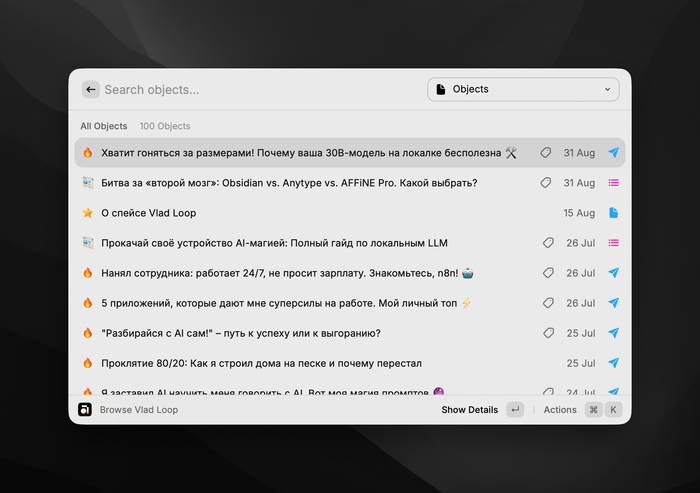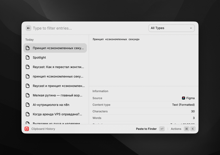 Raycast не сэкономил мне часы просто фактом своей установки. Он заставил меня переосмыслить сам подход к работе. Я перестал думать в категориях приложений («нужно открыть Obsidian»), а начал думать в категориях задач («нужно создать заметку»).