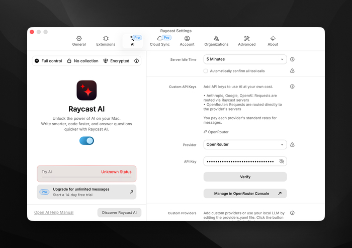 Ну и история с AI-провайдерами показательна. Команда Raycast долго не давала подключать свои ключи, что делало AI-функции почти бесполезными для тех, кто уже платил за OpenAI API. Хорошо, что они прислушались к сообществу.