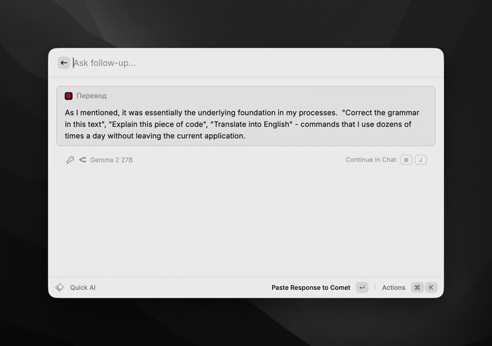 AI Commands. Как я уже сказал, это было по сути основным фундаментом в моих процессах. "Поправь грамматику в этом тексте", "объясни этот кусок кода", "переведи на английский" — команды, которые я использую десятки раз в день, не покидая текущего приложения.