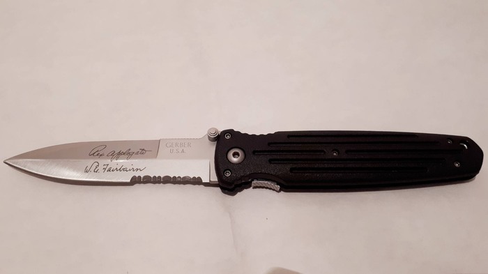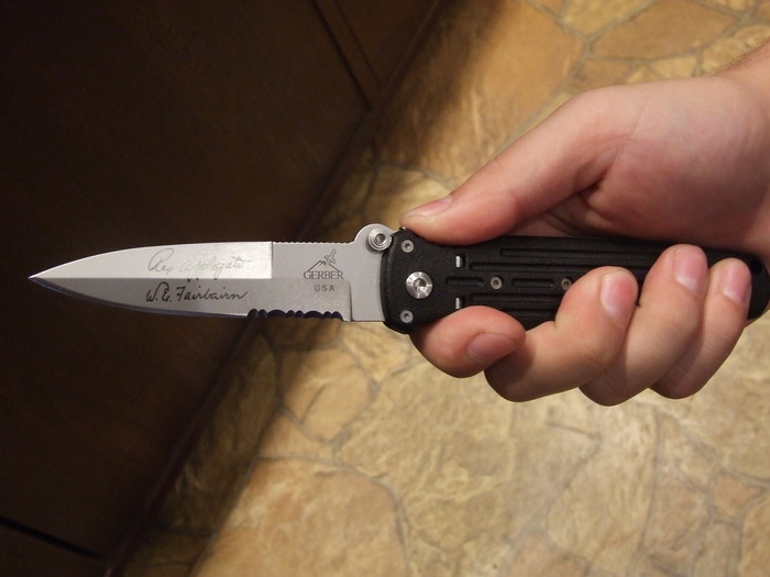 Gerber Combat folder Applegate-Fairbairn Еще один "боевой" складной кинжал. Имеет предохранитель для блокировки замка. Предохранитель достаточно надежен. Скорее всего кинжал не сложится на руку владельцу.