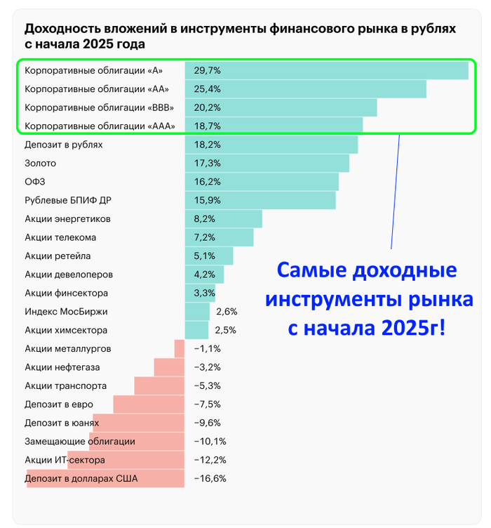 Банк России в своем «Обзоре рисков финансовых рынков» отметил, что наибольшую полную доходность с начала 2025г показали корпоративные облигации: