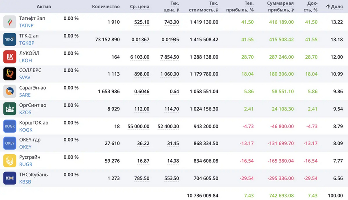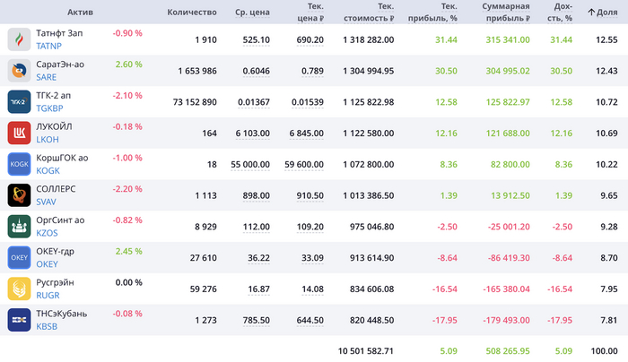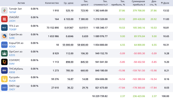 Мартышкин портфель: Казаньоргсинтез, Окей, СаратовЭнерго-ао, ТГК-2-ап, Коршуновский ГОК, Татнефть-ап, ТНС-Кубань, Лукойл, Русгрэйн, Соллерс.