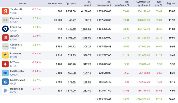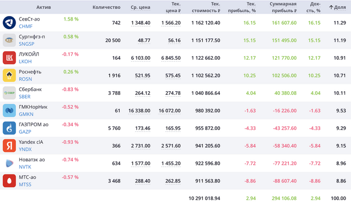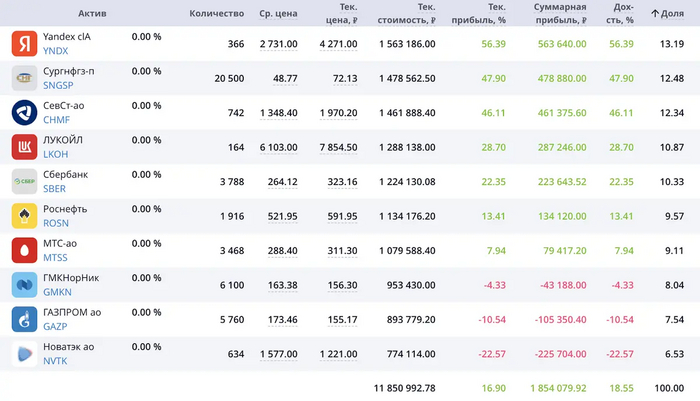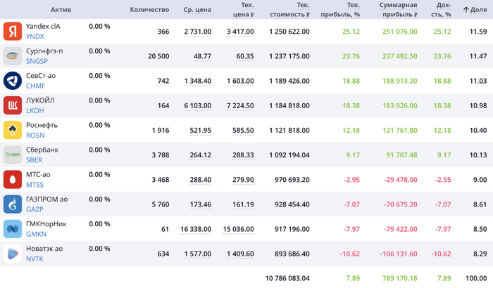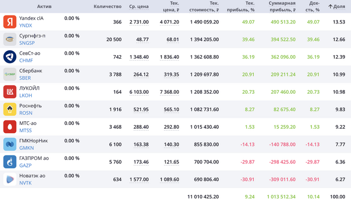 В итоге, народный портфель потерял 9,31% стоимости. В плюсе остались только 3 акции из 10: Яндекс, Сургут-п и Лукойл. Даже Сбер ушёл в небольшой минус. Итого по портфелю -930 855 рублей.