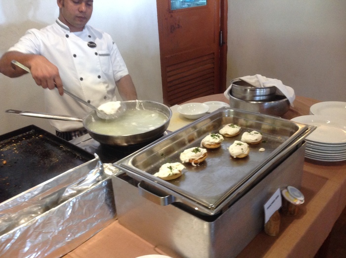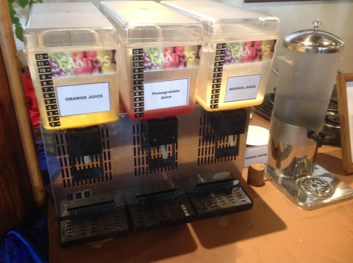 Время завтрака. Соки в диспенсерах из коробок, фреши делают на заказ и они дороже. Вот тебе и тропики(((