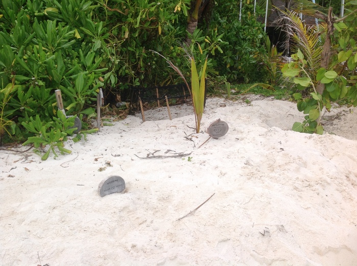 Сзади огорожена кладка черепашьих яиц. Сюда действительно приплывают черепахи и откладывают яйца.
