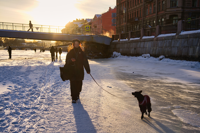 Если вы думаете, что на реке свободно и безлюдно то вы ошибаетесь, там более людно чем на Невском проспекте, все торопятся успеть погулять по замершим рекам и каналам, а на Фонтанке еще и очень красиво. Таким образом на льду оказались дама с картонкой, коробкой, и маленькой сабоченкой, семья с детьми, нет много семей с детьми, лыжники, блогеры которые вели сьемки, катались велосепедисты, а к чижику-пыжику собралась очередь.