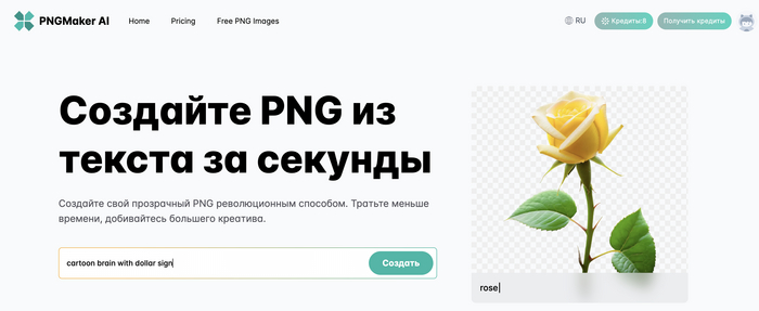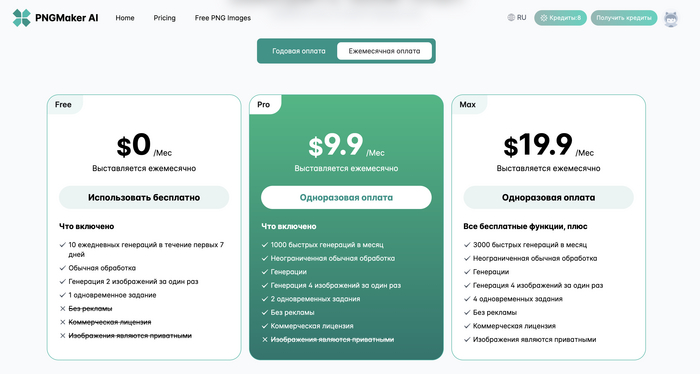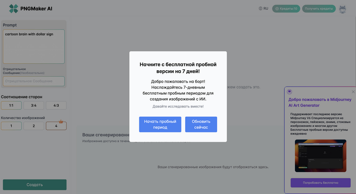 Я нажала “начать”, и мне начислили 10 кредитов = 10 генераций png изображений. Платные тарифы начинаются от 9$/мес.