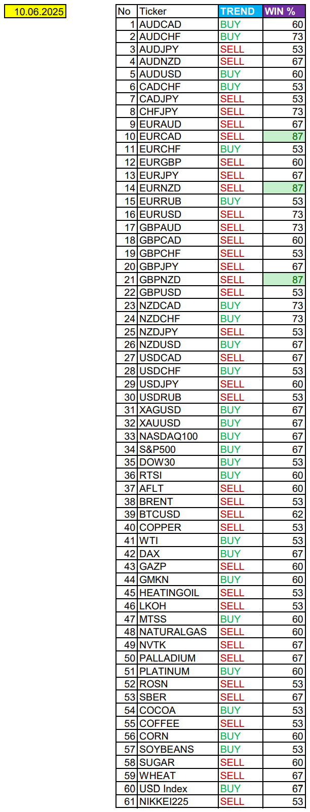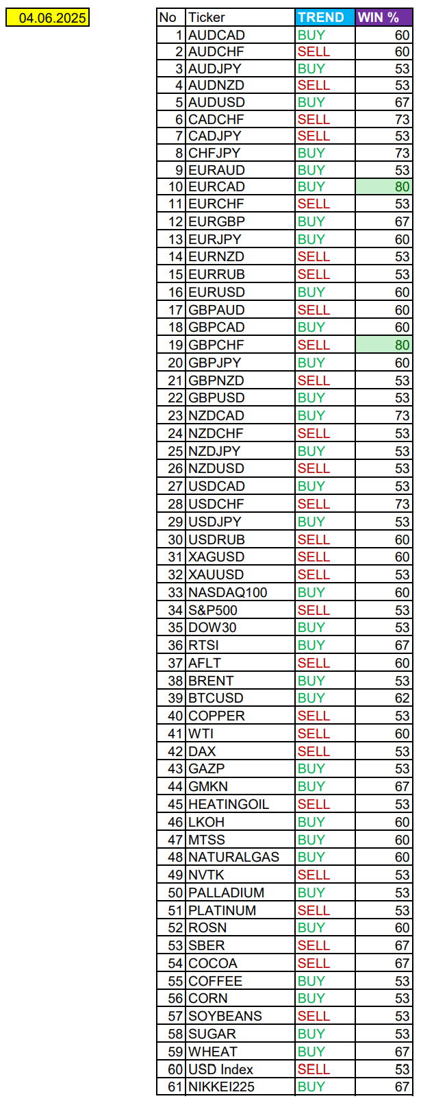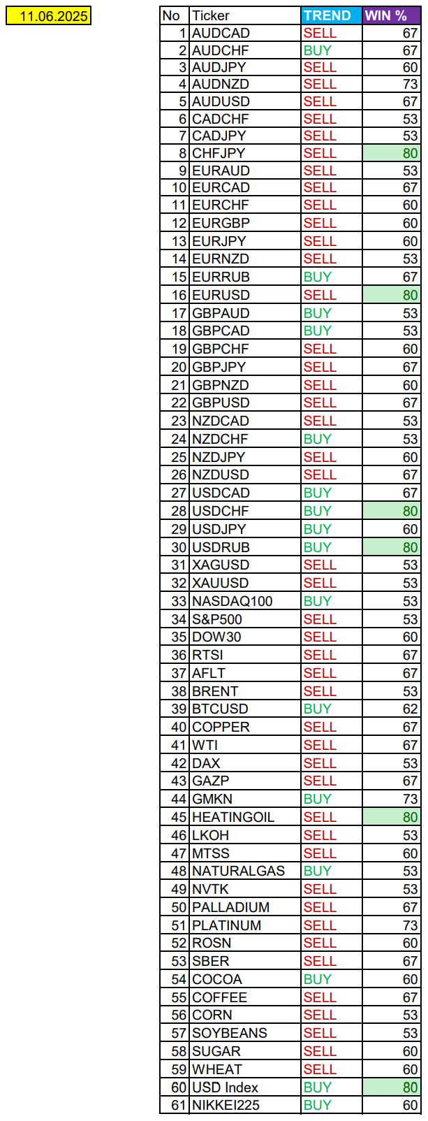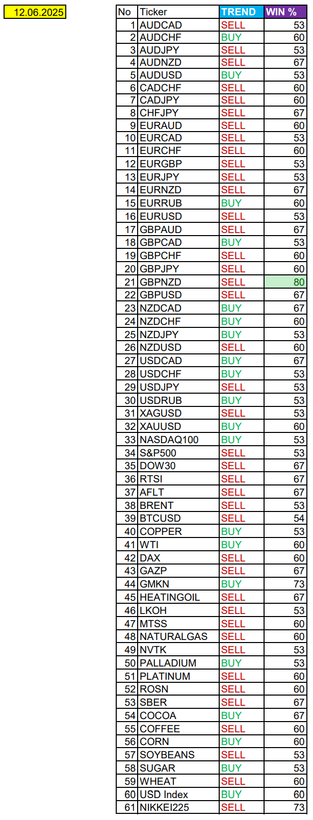 Очередные сезонные тенденции на Четверг 12 Июня 2025 по основным мажорам финансовых рынков.