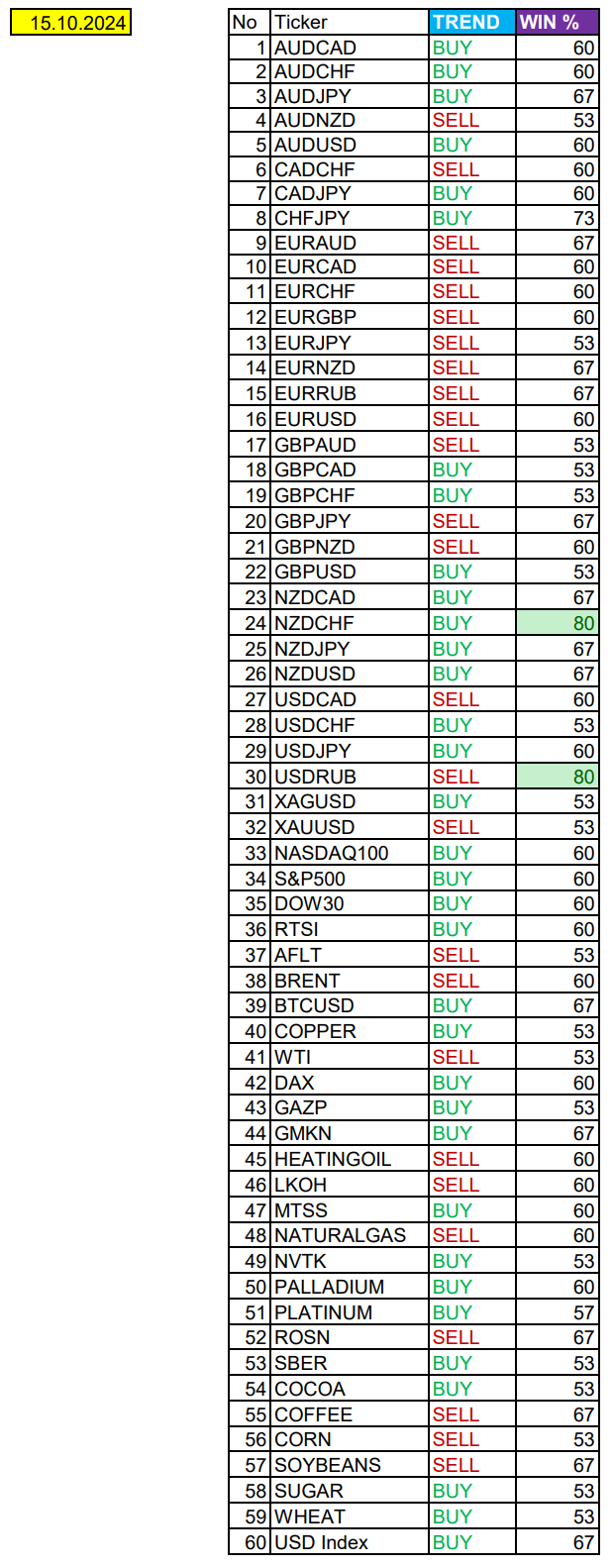 Очередные сезонные тенденции на Среду 23 Октября 2024 по основным мажорам финансовых рынков.