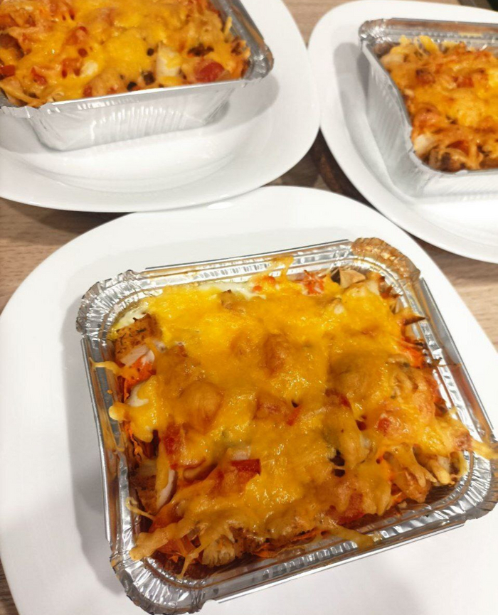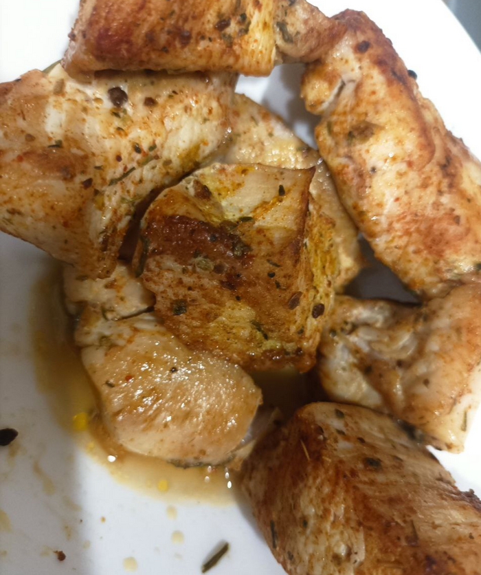 В это время параллельно нарезать филе, посыпать специями и на манер шашлыка на сильном огне обжарить с двух сторон, убавить огонь, под крышку, газ выключить. Нам не надо полную готовность, она допечется в духовке, но и сырую курицу в запеканку класть нельзя!!