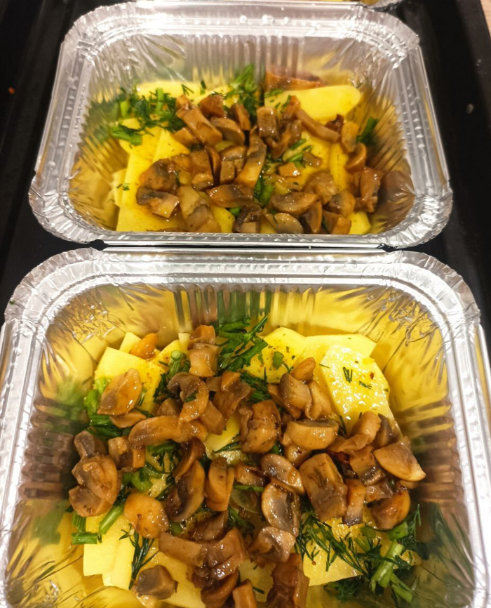 Также заранее надо поджарить мелко нарезанные шампионы, если таки их класть. Тоже можно не до готовности. Сок с них тоже в формочки вылить.