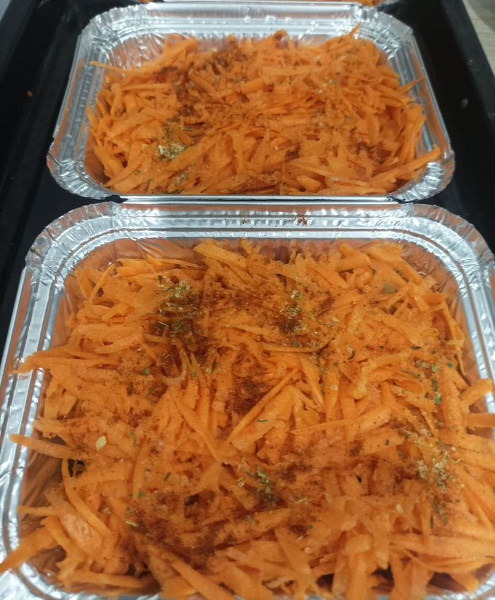 Натереть морковь. Посыпать специями. Немного утрамбовать, ну чтоб уместилось все в формочки.