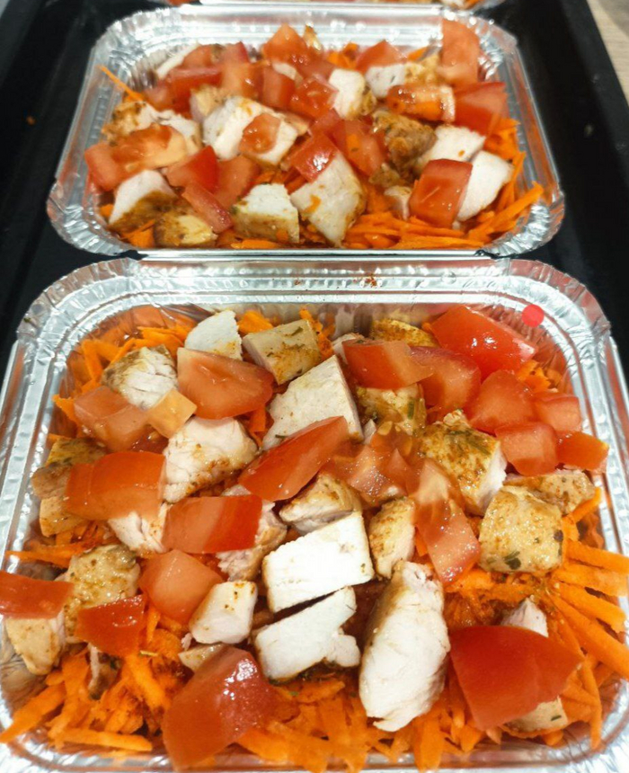 Нарезать помидор кусками 30х40мм, также примерно куриные уже остывшие кусочки.