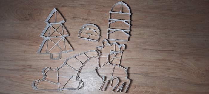 Если нужно сделать 10 пряничных саней, то вариант с вырезанием каждого из них по бумажке не подходил. Нужно было сделать формы для печенья. Материал для этих форм должен быть достаточно жестким, при это легко гнуться и резаться. После долгих поисков я пришла к ПВХ уголку 20х20мм. Уголок резался на 2 части по сгибу, все соединялось клеевым пистолетом, для перемычек половинка уголка резалась еще раз пополам.