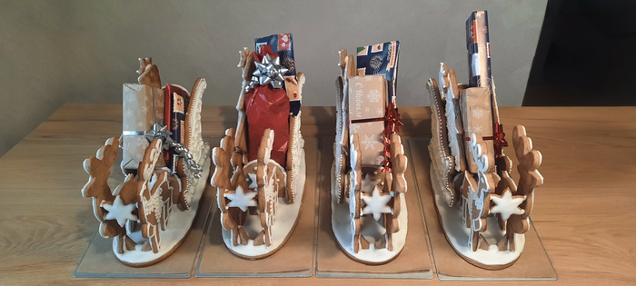 Для надежности перевозок каждые сани ставились на плотный картон и упаковывались в пленку. В результате вышли эффектные новогодние подарочки, которые никого не оставили равнодушным.