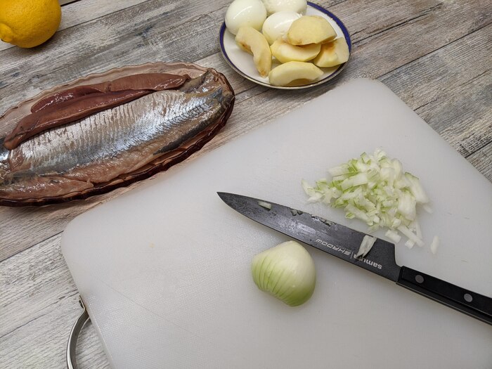 Таки да! Сначала нужно почистить селёдку. Будьте готовы к тому, что, пока ваши руки будут по локоть в селёдке, вам позвонят и напишут все, вплоть до двоюродной бабушки. Так что процесс сильно затянется.