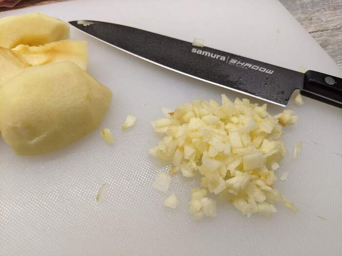 С остальным всё просто. Яблоки — обесхвостить и обессердцевинить. Чистить или нет — дело вкуса, я оставляю, с кожурой вкуснее. Лук почистить и на дольки. Булку замочить в воде (где-то советуют в молоке, но лично я его дома не держу). Закрепить мясорубку и форойс!