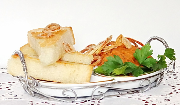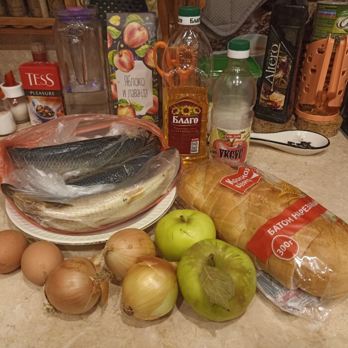 Булка. Ну как вам объяснить? Булка, которая батон, навроде "нарезного" или "подмосковного". Не белый хлеб, а именно что булка. В идеале вчерашняя или даже позавчерашняя. Лук репчатый, яблоки кислые — антоновка лучше всего. Собственно, всё. Но к форшмаку обязательно нужна подливка. Для неё понадобятся растительное масло, уксус и варёные яйца.