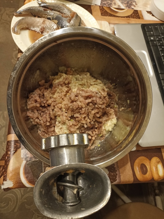 Пропускаем всё через мясорубку, лучше вперемешку, немного селедки, немного булки, немного лука, снова селедка... Булку, понятное дело, предварительно отжать. Если в селёдке была икра, можно туда же отправить. Папа всегда икру в дело пускал, но я не любитель, мне не нравятся икринки в готовом форшмаке, они хрустят.