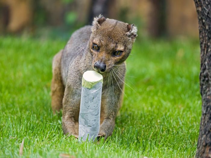 В тропических зарослях Мадагаскара иногда слышны звуки, напоминающие кошачье мурлыканье. Если незаметно подкрасться и присмотреться, вы увидите их источник. Это зверь, который мордой напоминает маленькую львицу, а хвостом — большого мангуста. Умывается животное как домашняя кошка: вылизывает передние лапы, потом задние, а напоследок — хвост. Ходит как медведь, опираясь о землю всей стопой. И шкура у этого создания почти такого же оттенка, как у нашего топтыгина.