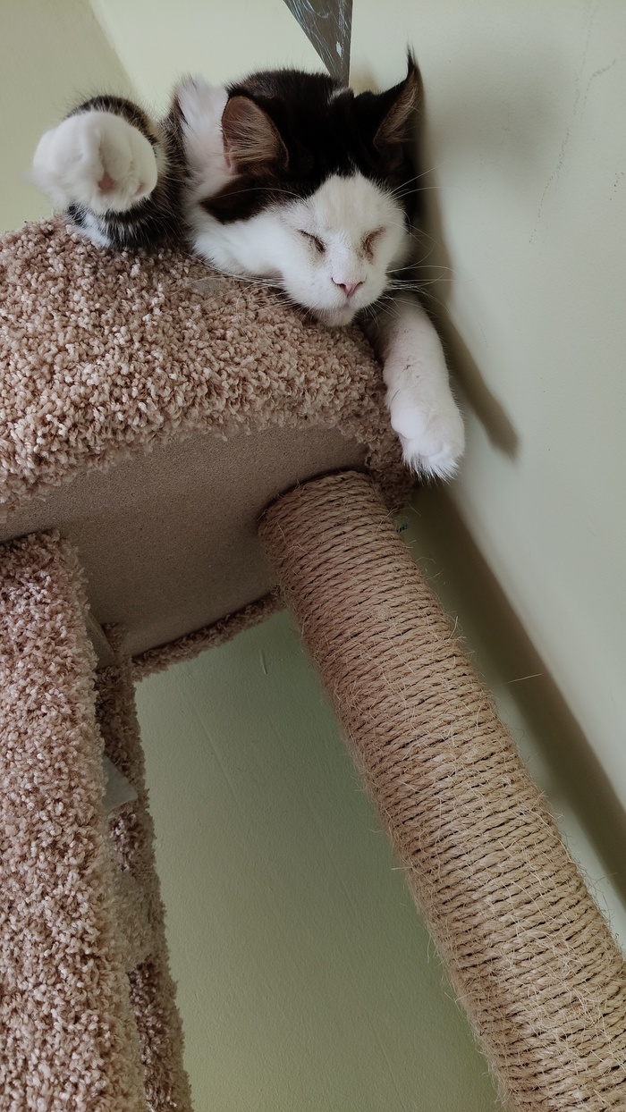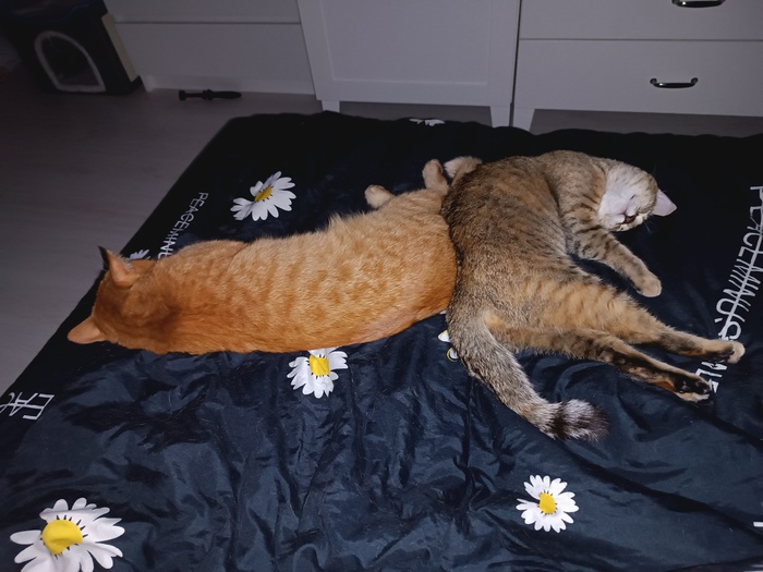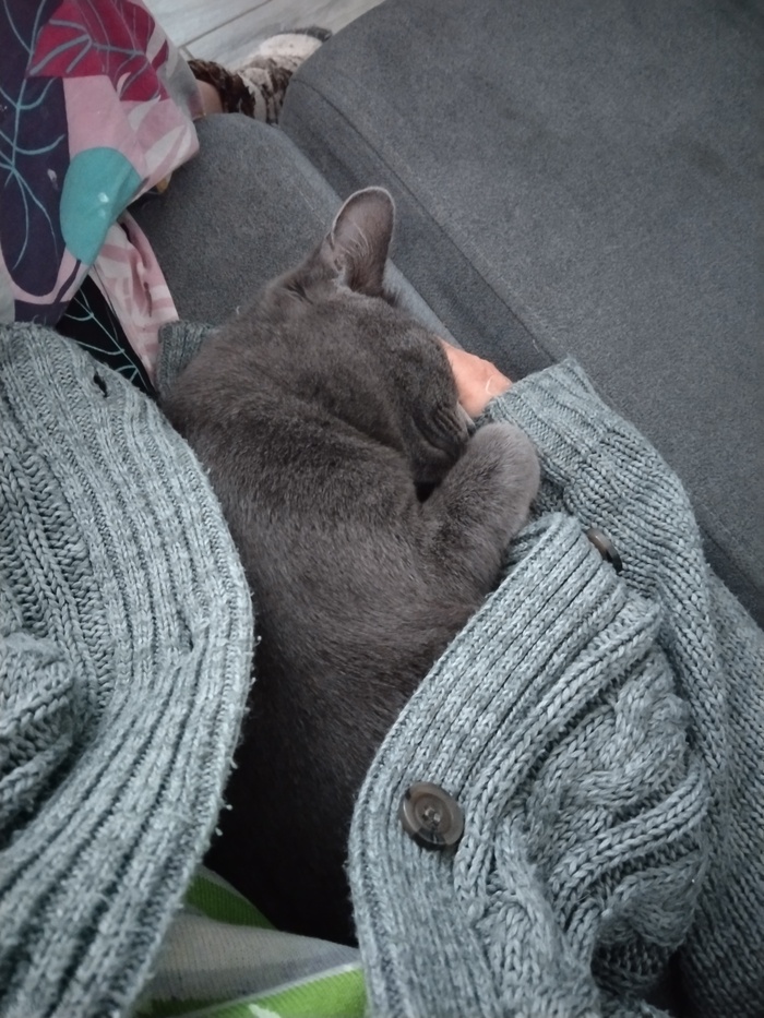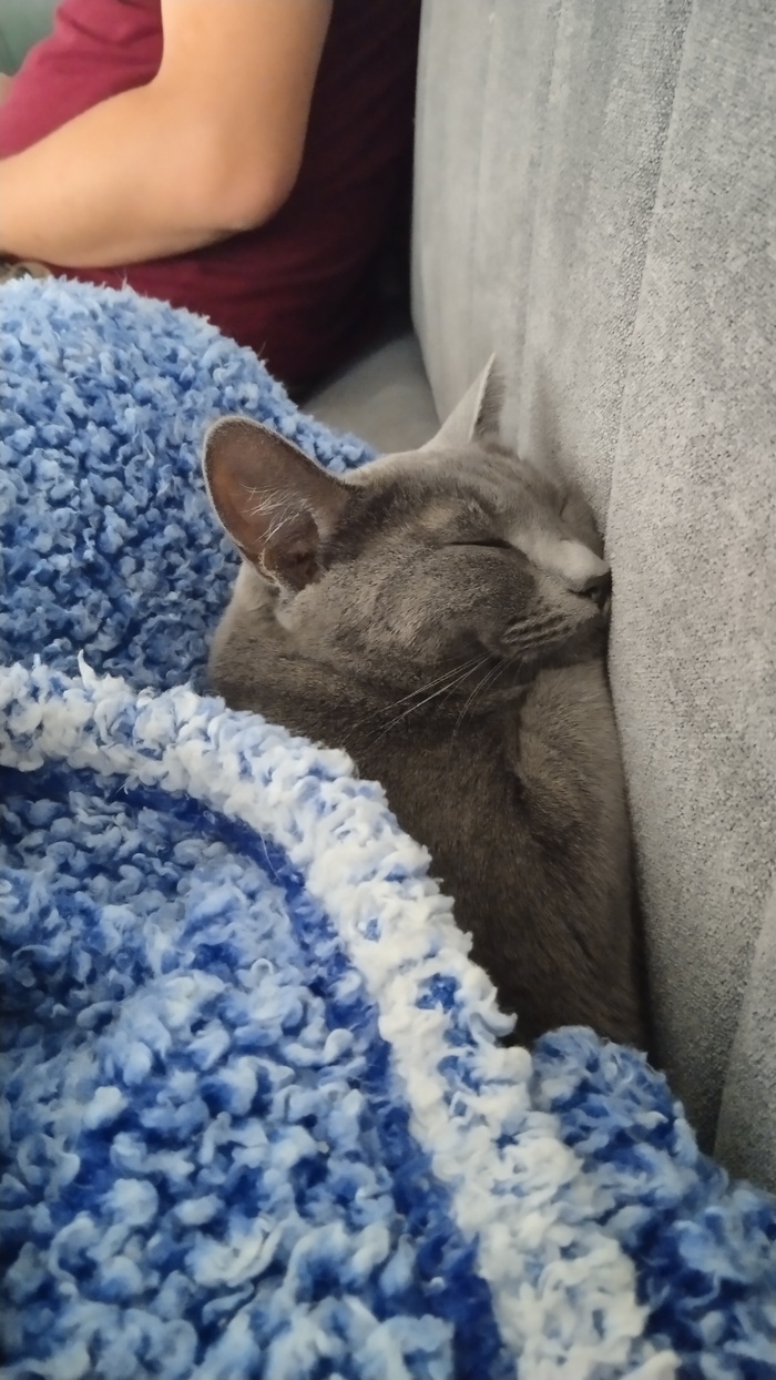 либо приходит ко мне и ложится на грудь и начинает засыпать, любит чтобы его чесали за ухом. Ева конечно иногда его достаёт своей активностью, и он на неё шипит, но порой они носятся вместе по дому и им весело, а это самое главное 🤗