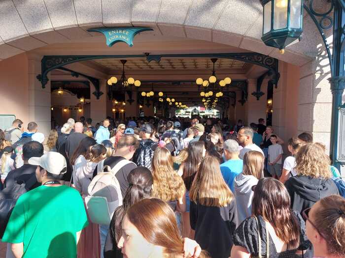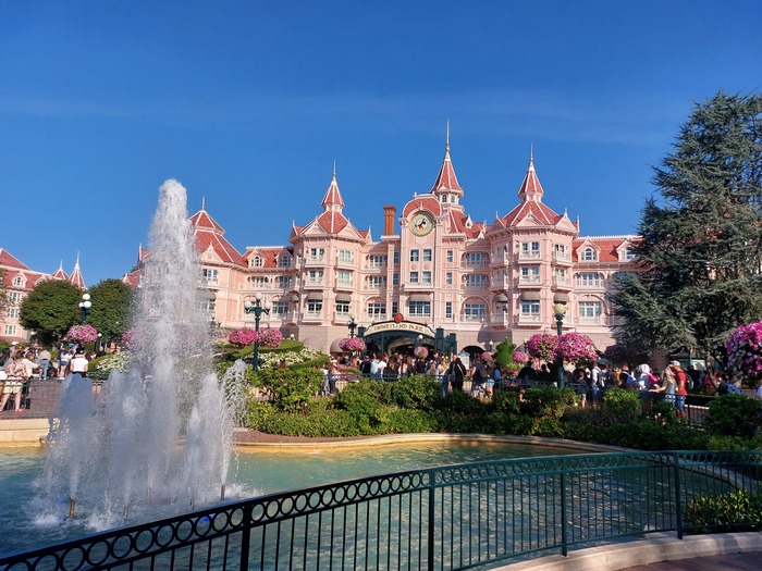 Далее, от парковки нам пришлось идти примерно 10-15 минут, минуя вякие ворота, траволаторы и пропускные пункты. В итоге, где-то в 9:15 мы оказались перед красивым зданием, окружённым фонтанами, которое, как понял выпоняло две функции – было воротами в сам парк и заодно – гостницией (на всякий случай оговорюсь – мы были именно в классическом «Диснейленде», потому что рядом там же находится более современный парк «Walt Disney Studios»).