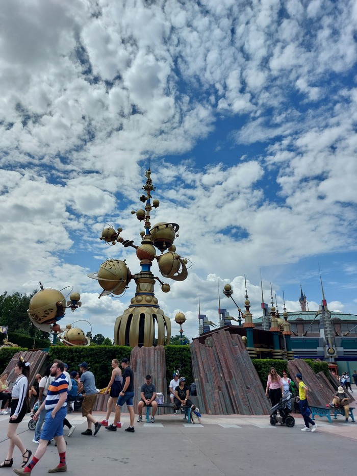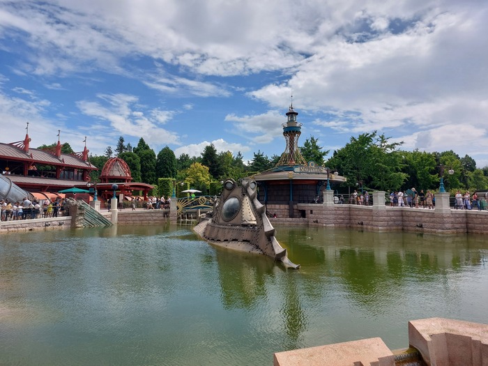 Наскоро перекусив не самым лучшим буррито по не вполне адекватным ценам в кафешке, стилизованном под мультфильм «Тайна Коко» (опять же, если хотите сэкономить 40-50 евро – берите еду с собой), где раньше (до выхода мультфильма) явно был просто условный салун из Дикого Запада, мы поняли, что времени у нас осталось максимум на пару аттракционов, ну и может ещё на небольшую финальную прогулку по парку. Из всего разнообразия я решил, что очень хочу прокатиться на аттракционе по мотивам «Звёздных войн» и мы отправились в «Страну открытий». Выглядит она прикольно, в таком стиле «стимпанк» из 60-х годов прошлого века, по центру даже есть подлодка капитана Немо «Наутилус», в которую можно забраться и осмотреть интерьер.