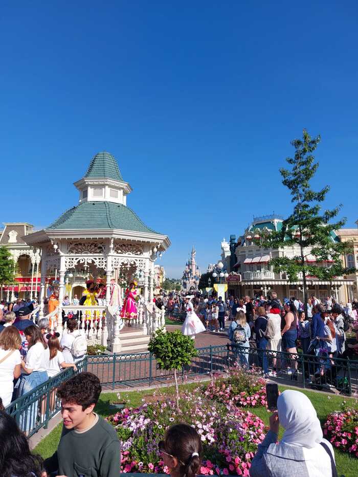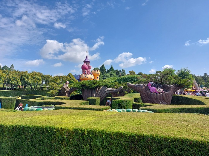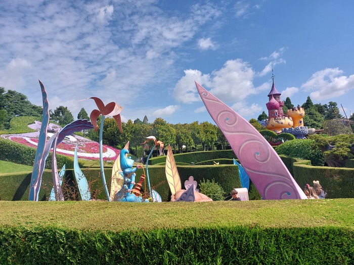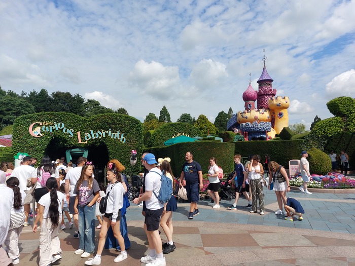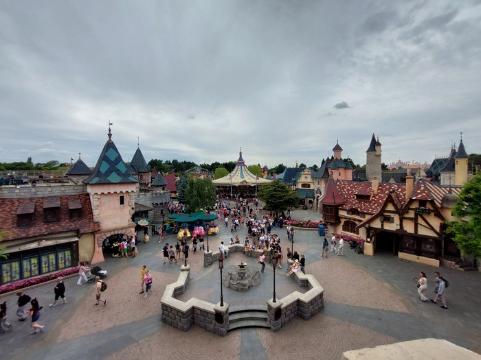 Побродив немного по замку, мы вышли в «Страну фантазий». Скажу сразу, хоть эта часть парка предназначена для детей дошкольного или младшего школьного возраста, мне она показалась самой милой, приятной и по-настоящему диснеевской. Всё там сделано очень мультяшно, и домики, и фонтаны, и карусели, вот прям ми-ми-ми. Единственное, что возвращало меня в реальный мир – это очереди, ОЧЕРЕДИ, ОГРОМНЫЕ ОЧЕРЕДИ ВЕЗДЕ. В посте про «Леголенд» я тоже жаловался на очереди, но по сравнению с тем, что вас ждёт в «Диснейленде», там очередей просто нет. За 1,5 часа мы смогли посетить всего 2 атракциона – «Белоснежка и 7 гномов» и «Питер Пен». Да, они были очень прикольными, с классными анимированными фигурами, прекрасной музыкой, полётом надо ночным Лондоном и прочим, но всё это длится от силы пару минут, а скорее всего и просто минуту, но в очередеи ты будешь стоять минимум 45 минут, а скорее всего 1 час – 1 час 20 минут (ещё один прекасный момент, наряду с отсутсвием карт на английском – все персонажи внутри аттракционов говорят на французском языке, что, понятное дело, объяснимо географией локации, но как-то вроде парк интернациональный, можно было бы что-то придумать и с английским хотябы). При этом нет ни тентов, ни зонтов, так что на солнце можно просто расплавиться. Хорошо, что я параноик и взял на всякий случай зонт – под ним было ещё более-менее терпимо. Да, для тех, кто не хочет стоять в очереди, есть специальный билет, но стоит он в 2 раза дороже и, как показала практика, стоять вам всё равно придётся, пусть не час, но минут 20-30 точно.