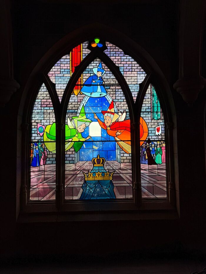 Умилившись всей это картине, мы двинулись дальше, к, по моему мнению, главному зданию парка – замку Спящей красавицы, являющемуся воротами в «Страну фантазий» - часть парка, посвящённую классическим мультфильмам Диснея (парк разделён на 5 тематических зон, о которых я напишу дальше). Замок, конечно, впечатляет, он именно тот самый, настоящий, сошедший прямо с заставки «Диснея» и такой же, как я помню из роликов «Дисней-клуба» (хотя, там, скорее всего показывали американский «Диснейленд»). Я стоял и смотрел на него, наверное, минут 5, практически не моргая, постепенно переваривая тот факт, что, наконец-то, спустя столько лет мечтаний, увидел его вживую. Внутри он оказался очень небольшим, на первом этаже было пару сувенирных лавочек, на втором – история «Спящей красавицы», выполненная на витражах, а в подвале спал (и периодически просыпался с грозным рычанием и дымом из ноздрей) большой дракон. Также, можно было выйти на балкон и увидеть всю «Страну фантазий» сверху. В целом, мне кажется, на этом можно было и заканчивать посещение парка, потому как замок и вид с его балкона так и остались самыми лучшими для меня впечатлениями.